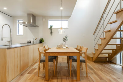 キッチンには木の年輪を立体的に浮き立たせた無垢キッチンを採用し、床には木目豊かなフロア材を使用しています。ダイニングスペースや階段部分には吹き抜けが設けられており、上部から自然光が降り注ぎます。