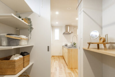 脱衣ランドリー室には室内干し用のホスクリーンや家事カウンター、可動棚が備えられており、「脱ぐ・洗う・干す・畳む・片付ける」という一連の作業がこの1つの空間で完結します。他にも、家族の靴やコートをしまえる玄関の全面収納や、トイレ・洗面の隠し収納やニッチなど、家全体をすっきり保つための収納計画が随所に施されています。