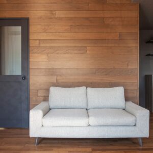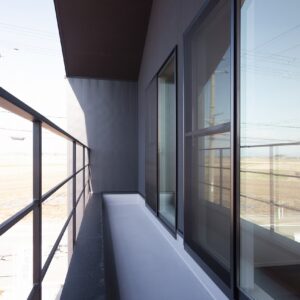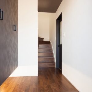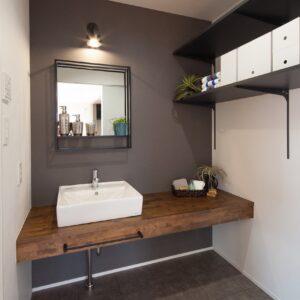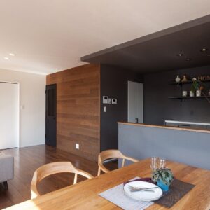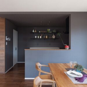 外観はとてもシンプルでデザイン性の高い佇まいに。 屋根付きバルコニーやサンルームを設け、雨の日も室内干しができて安心です。キッチンはシックな色合いを採用、また希少価値の高い天日干しの珪藻土の塗壁を採用。調湿性が高く、年中すっきりした空気感を保ってくれます。