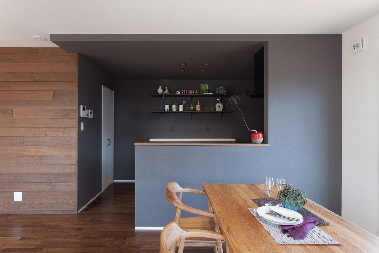 外観はとてもシンプルでデザイン性の高い佇まいに。 屋根付きバルコニーやサンルームを設け、雨の日も室内干しができて安心です。キッチンはシックな色合いを採用、また希少価値の高い天日干しの珪藻土の塗壁を採用。調湿性が高く、年中すっきりした空気感を保ってくれます。